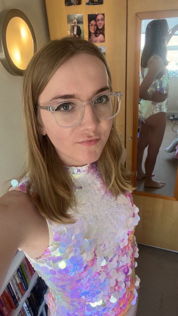 When I think back to where I was when writing Reading 4, in which I describe my feelings of freakishness on wearing a one-piece swimsuit, I can really see how far I’ve come. Because, like I feel like this crazy sequin leotard does really look good on me. I mean, it’d look good on most any woman- it’s a brilliant garment- but it’s important for me because I used to feel much more hopeless, much more doomer-y about this sorta thing in particular.