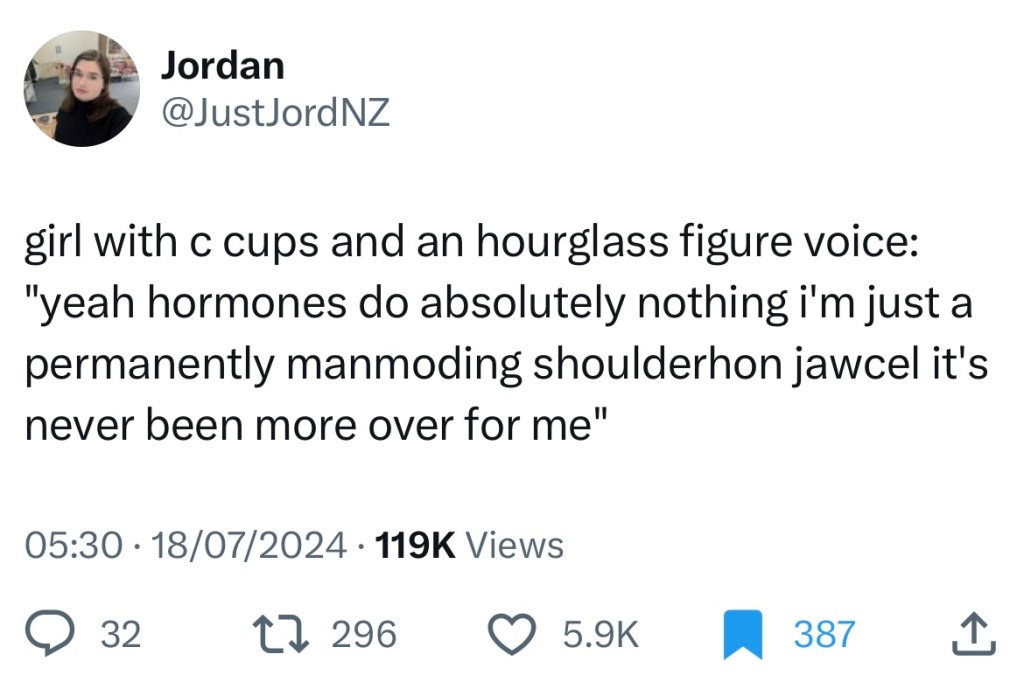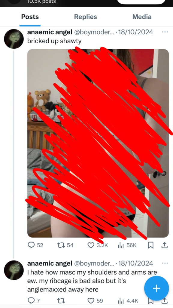 To make this worse, my Twitter feed was also filled with a particularly nasty group of young and insecure transmedicalist trans women posters at the time, who self identified as ‘hsts’ and would mercilessly mock those they saw as ‘agp’ to make them feel better about themselves. With these and the trans doomers filling up more and more of my feed, I began to be presented with two forms of trans womanhood, both of which centred on forms of self-loathing and cruelty. The angry young transmedicalists probably had an equally bad, though different effect on me during this time period, enough that I could’ve dedicated this post to that instead. More than anything, I’m focussing on the trans doomers in this post for ease and convenience.