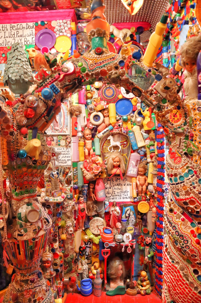 Created by artist Stephen Wright, the house is intricately decorated with the discarded minutiae of everyday life: bleach bottles, broken mugs, dolls and toys etc. There’s a childlike kind of attention payed to the smallness and uniqueness of things that are usually forgotten or overlooked by us adults: the texture of a bottle cap; the indentations on the underside of a mug; the bright plasticky allure of pez dispensers.