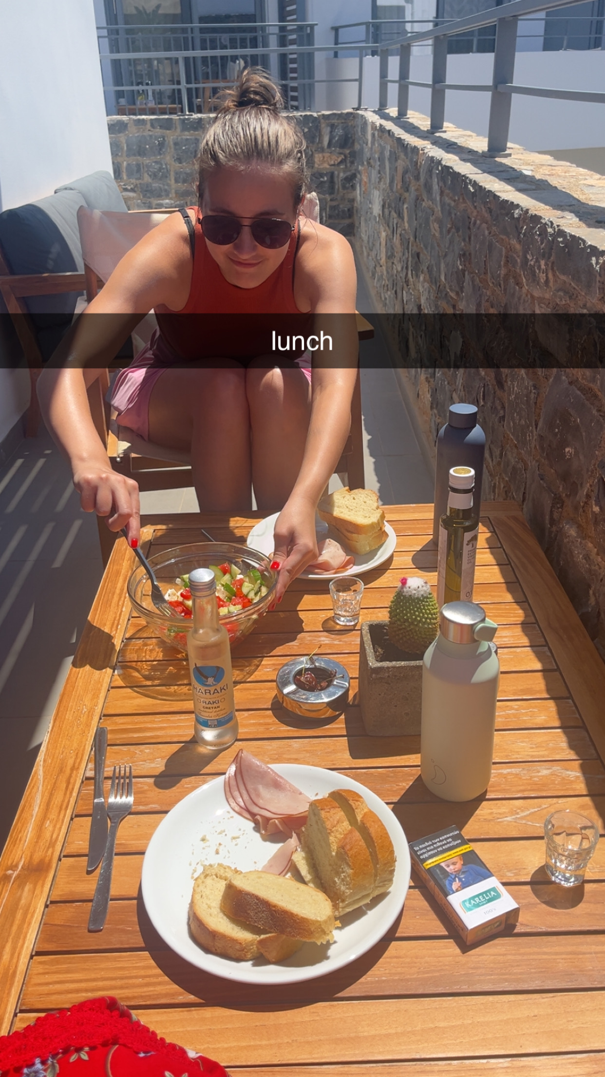 At lunchtime, we’d go back to the room, make a Greek salad consisting of cucumber, tomatoes, feta, olives, olive oil, honey, salt and pepper, and have some kind of feta omelette on the side. It was always totally delicious, enjoying it on the balcony sat across from Molly, drinking down a few glasses of ouzo or raki.