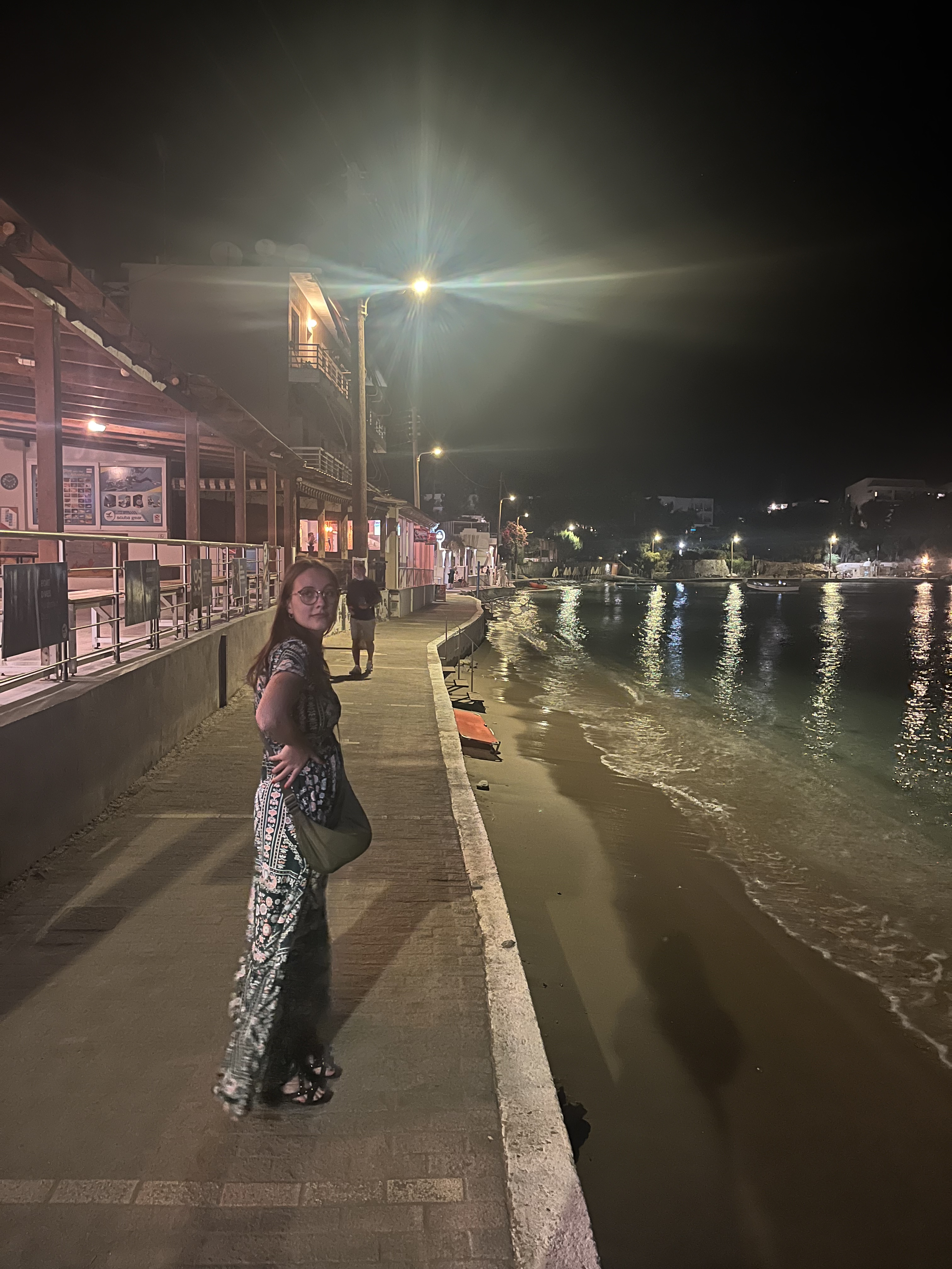 Everything- the supermarket- the beach- the souvenir shops- the restaurants- was within a 2-3 minute walk of the hotel, the vast majority of the town’s restaurants being clustered along the shoreline, replete with sea views. We went for an unfashionably early dinner along the waterfront: tzatziki, bread, dakos which is a Cretan Bruschetta and some obligatory gyros. We’d both been learning Greek in advance of the trip, and it was here, very tired from a day of travelling, that Molly made our fullest attempt at speaking in Greek to the locals: Θα ήθελα ψωμί, ντάκος και γύρο κοτόπουλου παρακαλώ. If anything, I’m just glad I’ve come away from it being able to read the letters.