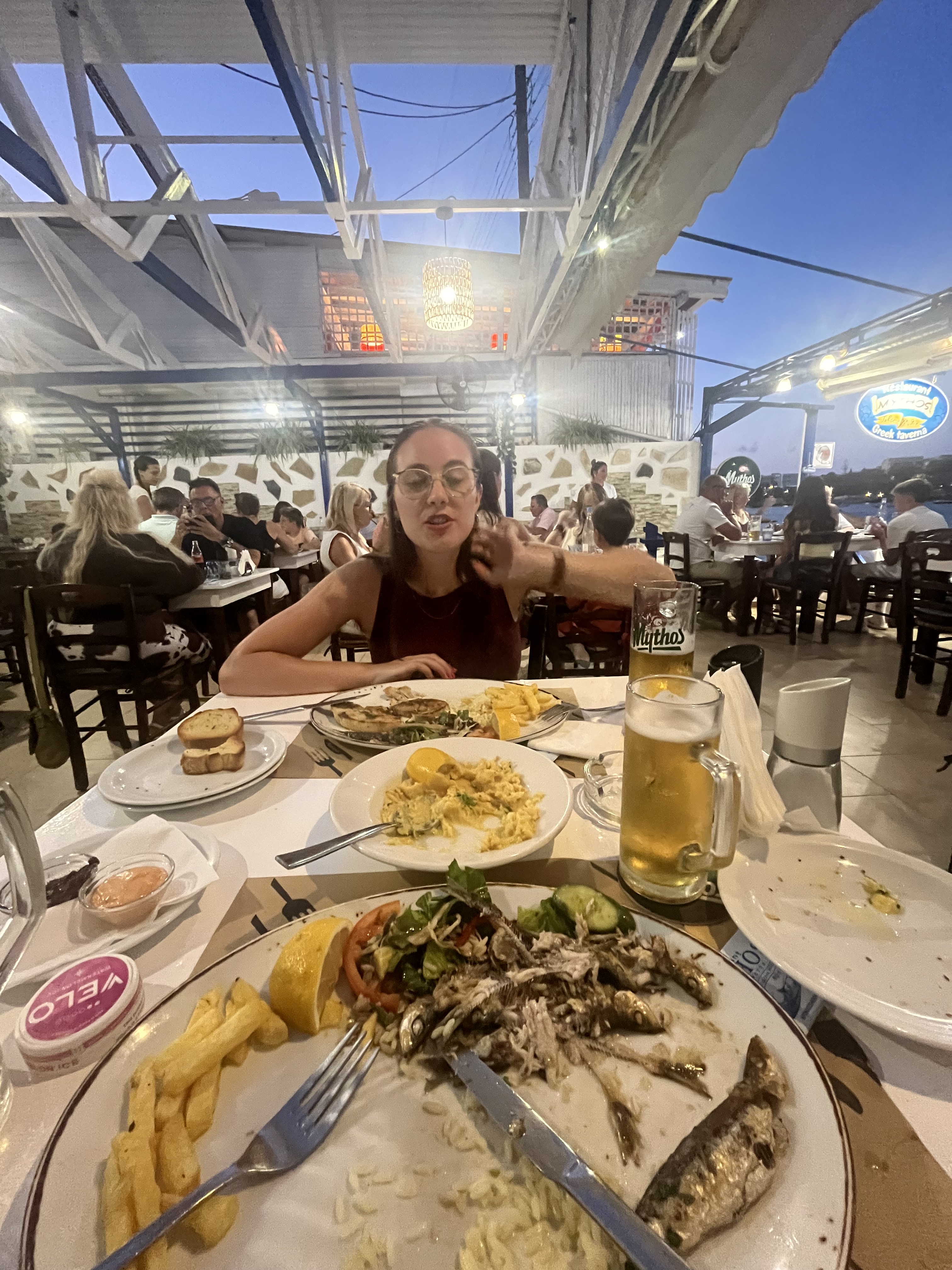 We sat, taking in the environment, and looking out to sea. The food was good, though the gyros was mid as it so often is, and the big glasses of beer hit big. From then on we mostly ate whatever fresh fish was on offer.