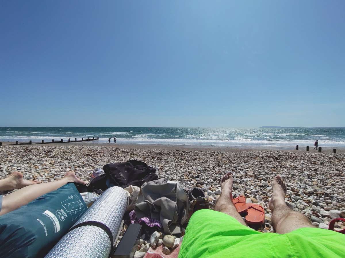 Like many this summer, it was a warm, sunny day, and we got the train to Chichester laden with our camping gear, stopping in the city for a lunch at Wagamama’s- which I hadn’t been to for years- it hasn’t changed. I used the toilet cubicle to put my blue swimsuit on under my dress ready for the beach. Afterwards, we caught a twenty minute bus to a town called Bracklesham on the south coast.